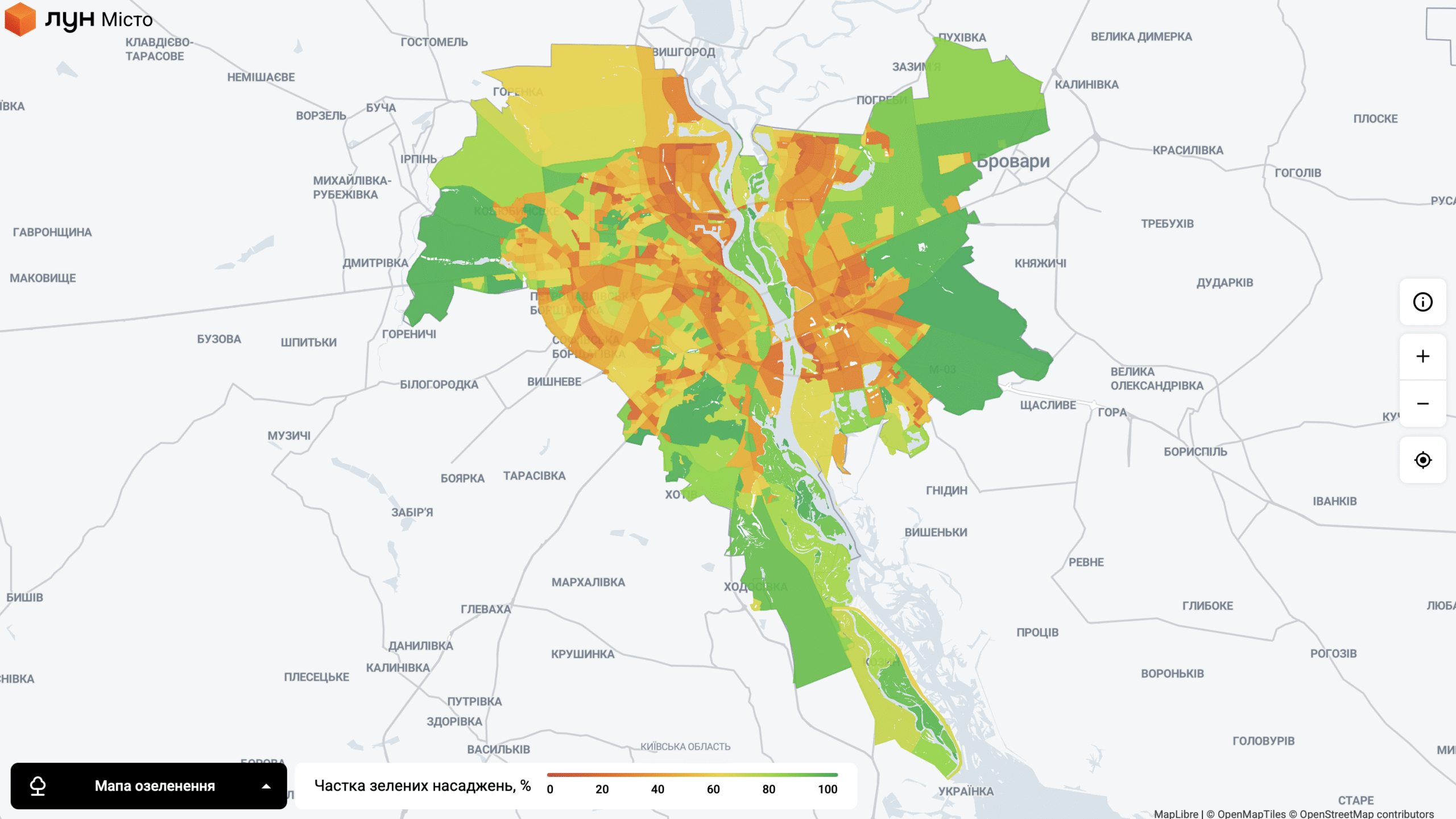 Відтепер кияни можуть подивитися, наскільки зеленим є їхній район — ЛУН презентував інтерактивну Мапу озеленення Києва. Вона дозволяє в деталях побачити, де у столиці найбільше парків і скверів, а де — «сіра зона» без зелені. Супутник рахує всю зелень – і на публічних, і на непублічних зелених зонах.