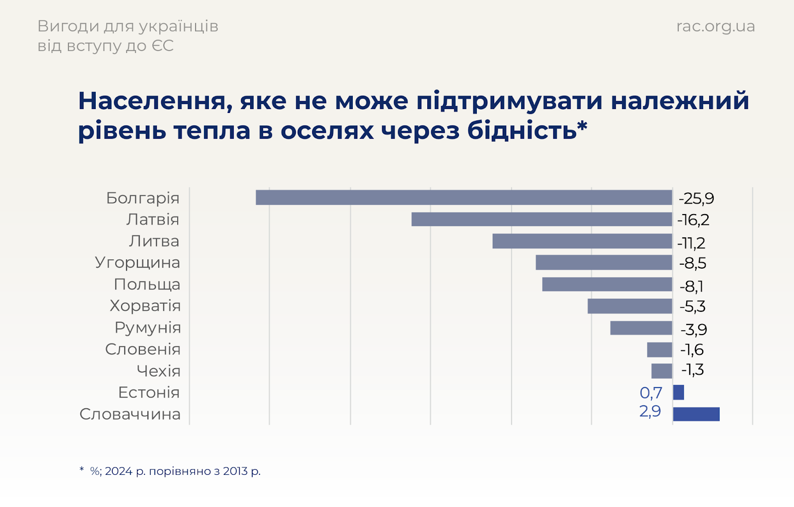 Країни, які приєдналися до ЄС, демонструють стабільне зниження кількості людей, які не можуть опалювати свої домівки через бідність. Зменшення енергетичної бідності – це покращення здоров’я населення та комфорту в оселях.