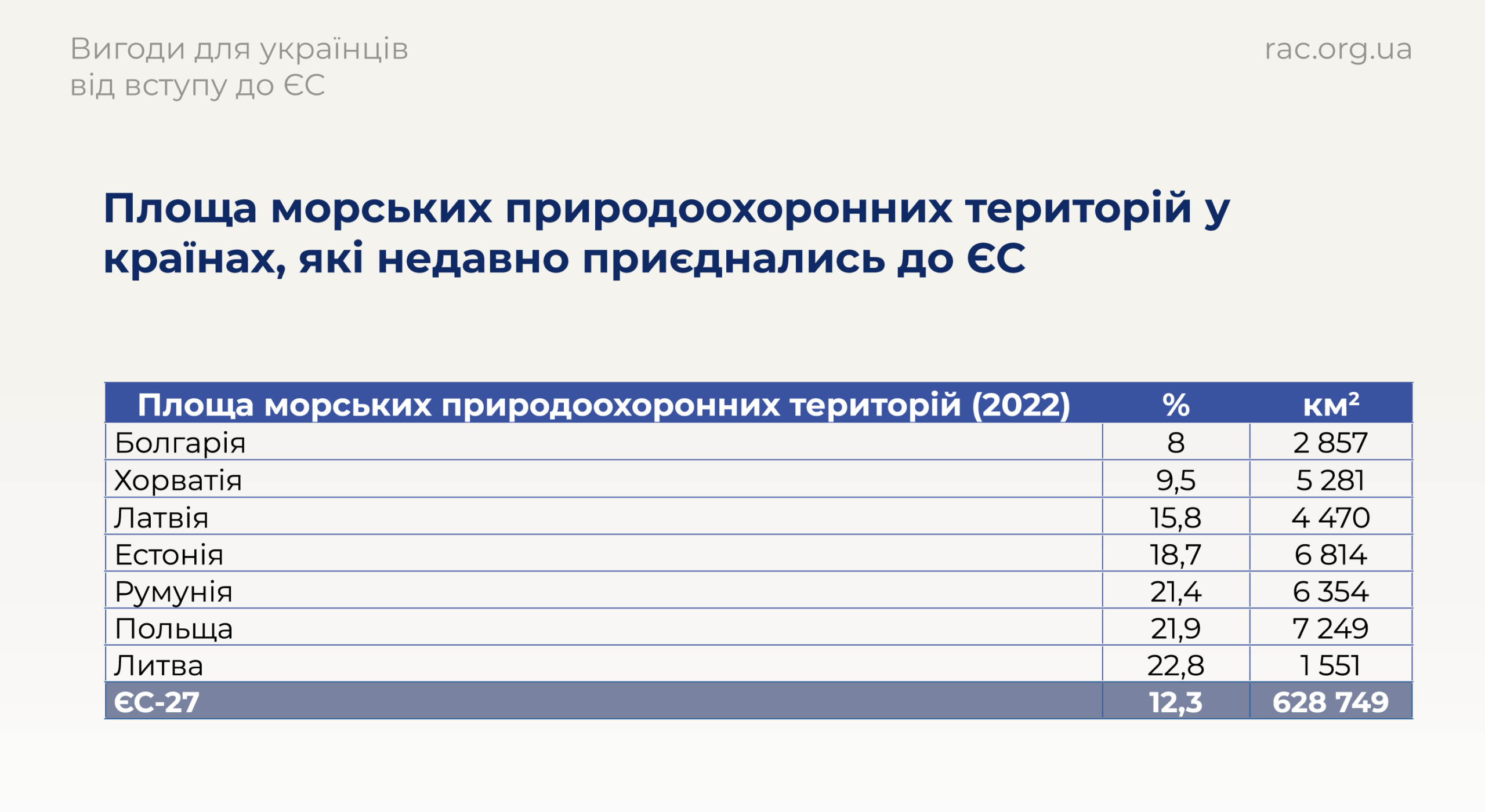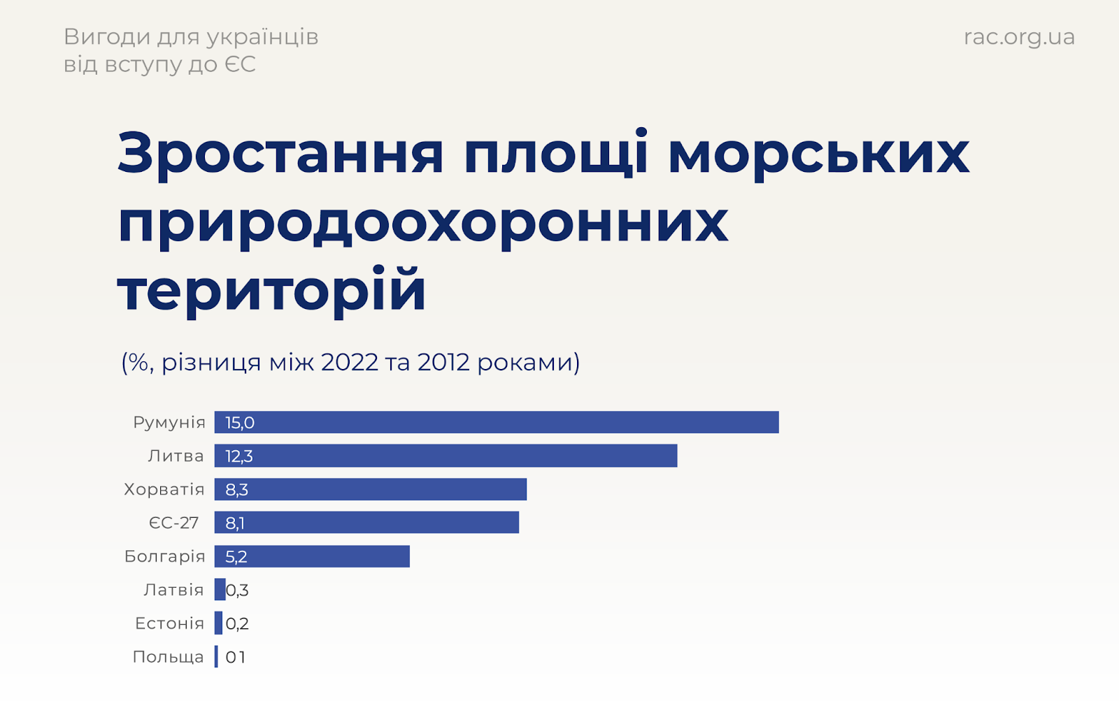 Вступ до ЄС сприяє збільшенню площі морських природоохоронних територій, що є запорукою збереження морських екосистем, забезпечення здорового для життя довкілля та продовольчої безпеки.