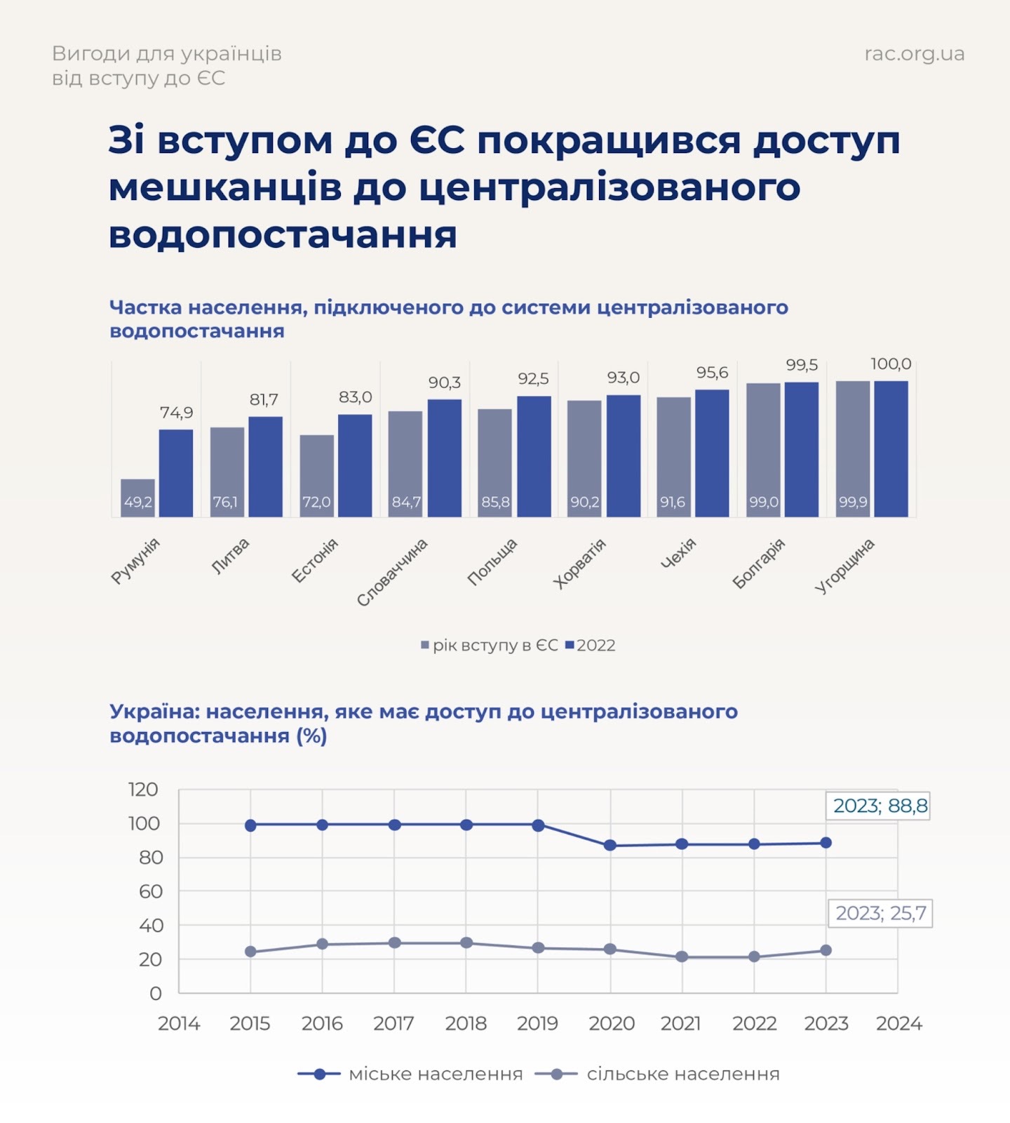 У 2023 році лише 65% українців мали доступ до централізованого водопостачання. Для міського населення ця частка становила 88,8%, а для сільського – 25,7%. У подібній ситуації перебували і деякі держави-члени ЄС на момент вступу.