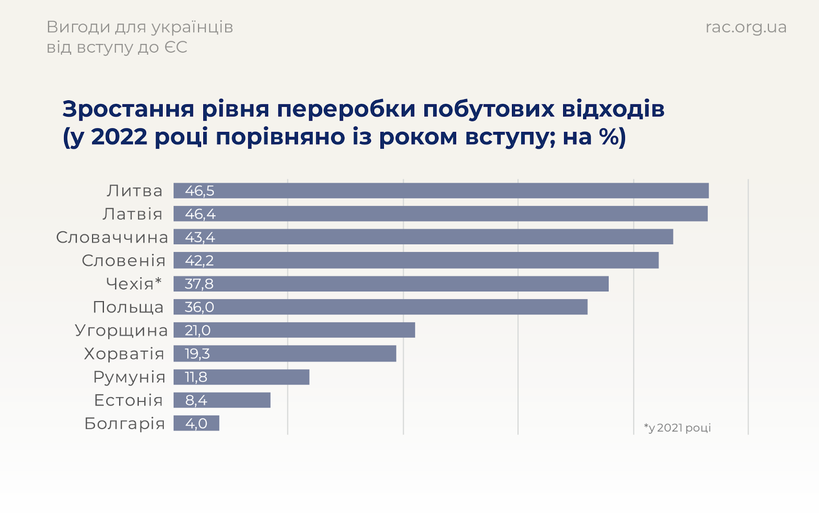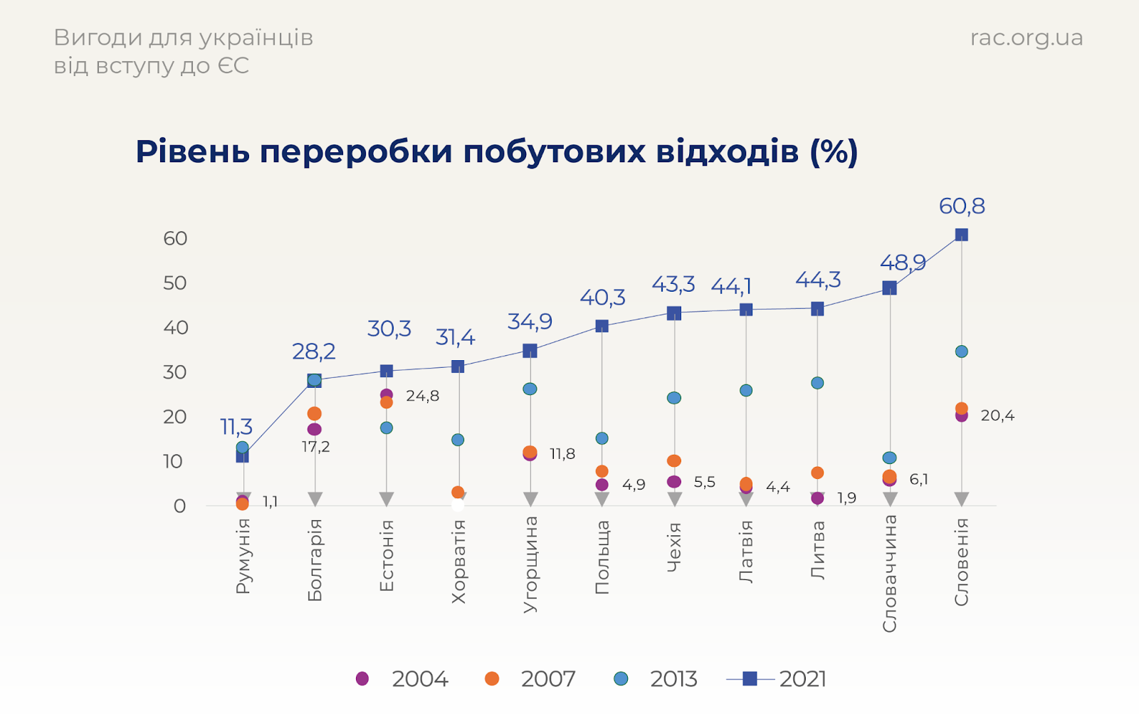 Найбільше зростання рівня переробки побутових відходів з часу вступу в ЄС демонструють Литва (46,5%), Латвія (46,4%),Словаччина (43,4%) та Словенія (на 42,2%). Найменший рівень зростання продемонстрували Естонія (8,4%) та Болгарія (4%).